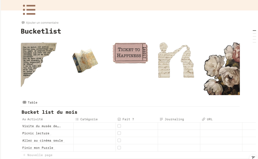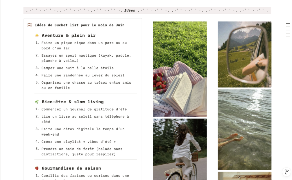 Visualisez vos ambitions et créez une ambiance motivante pour votre mois. Cette page est l'endroit idéal pour réunir vos inspirations visuelles et vos aspirations, afin de nourrir votre motivation au quotidien.